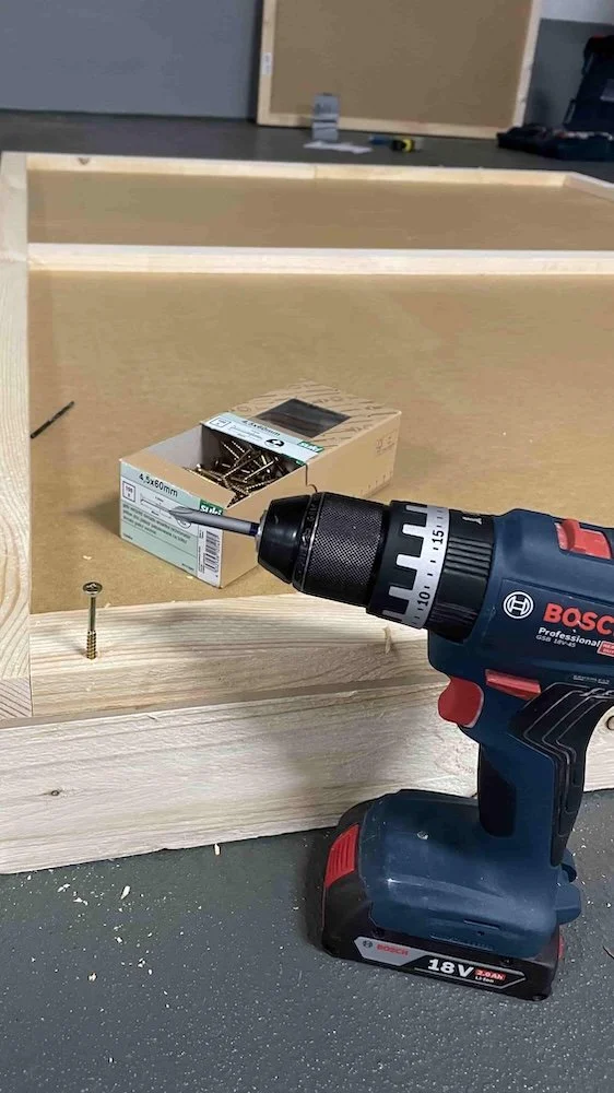 Side boards were cut to match the dimensions of the fully wrapped painting. These formed the walls of the crate and were assembled using long screws, with each hole pre-drilled for a clean finish.